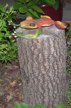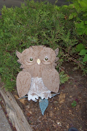 The owl seems content to be on guard, no matter the season, and the frog 004atop a stump brought from Tahlequah, does look a bit less bright and shining than he did this spring but that’s all right. He may be older but no doubt, he’s wiser too. After all, he gleaned information from the squirrels or the occasional strolling cat and I’m sure the birds were full of news all summer as they perched above him and sometimes that diminishes the shine–a bit.005