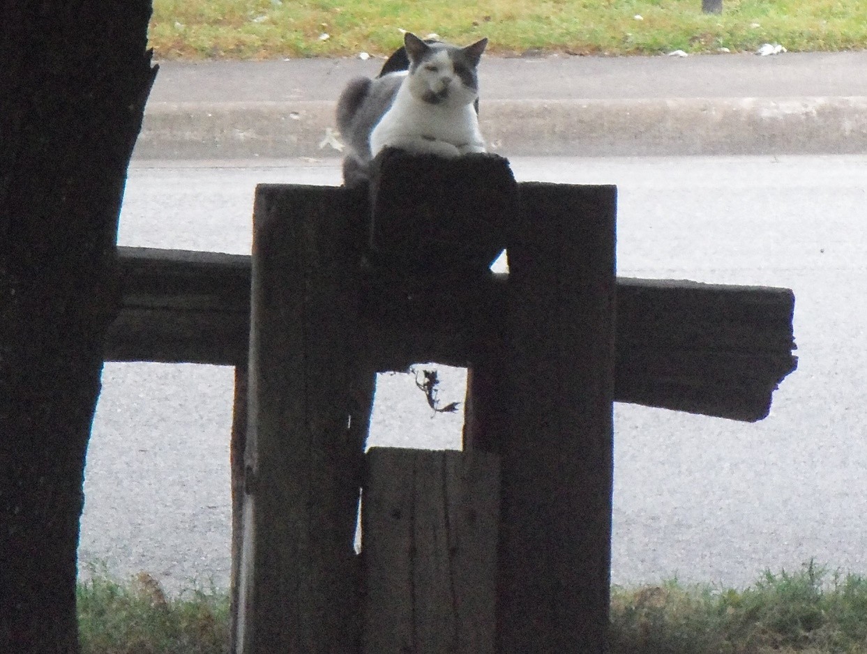 Do you ever get the feeling that someone is watching you? Yesterday, that was not only a feeling, it was a fact. Mr. Gray, atop the mailbox posts, had his feline eyes directed right at my window. I like to think he was guarding the house against lions and tigers, and all other impossible threats. Actually, he had just had a bowl of crunchy food and probably was feeling comfortably lazy. I don’t know Mr. Gray’s true identity. He’s rather a man about town, footloose and fancy free, but he has a charming personality, is a good conversationalist, and drops in for breakfast now and then. I suppose he’s a man of mystery.