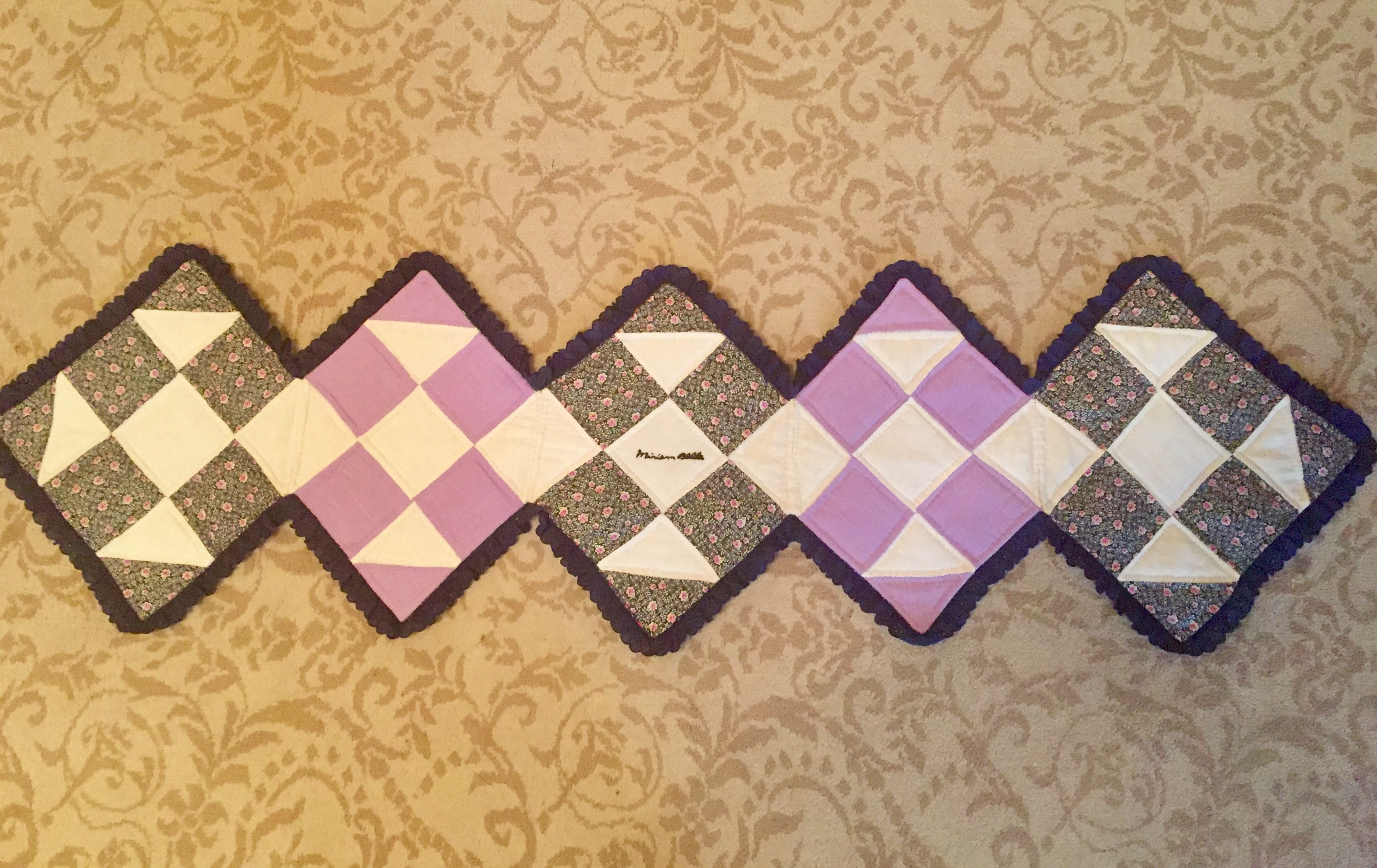 Jane brought a lovely table runner made from blocks from her grandmother’s quilt. Jane’s mother had put these together, backed them with pretty material, and quilted them into the table runner. Jane copied her grandmother’s signature, Miriam Belle, onto the center block and embroidered it. A beautiful reminder of her family.