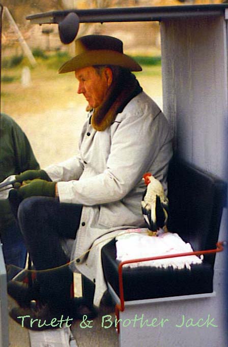 Then there was Judy’s Uncle Truett and Brother Jack who was actually a talented pet. Uncle Truett had a team of mules and a wagon. He gave rides to people. Going along with him was a rooster named Brother Jack. Brother Jack rode along on a perch in the wagon. He had a leather thong attached to his perch and his leg. The reason was that Brother Jack would get sleepy and when he did, he fell off the perch. So, as Uncle Truett drove, likely as not, Brother Jack dangled by the strap from his perch, snoozing peacefully.Truett & Brother Jack (2)