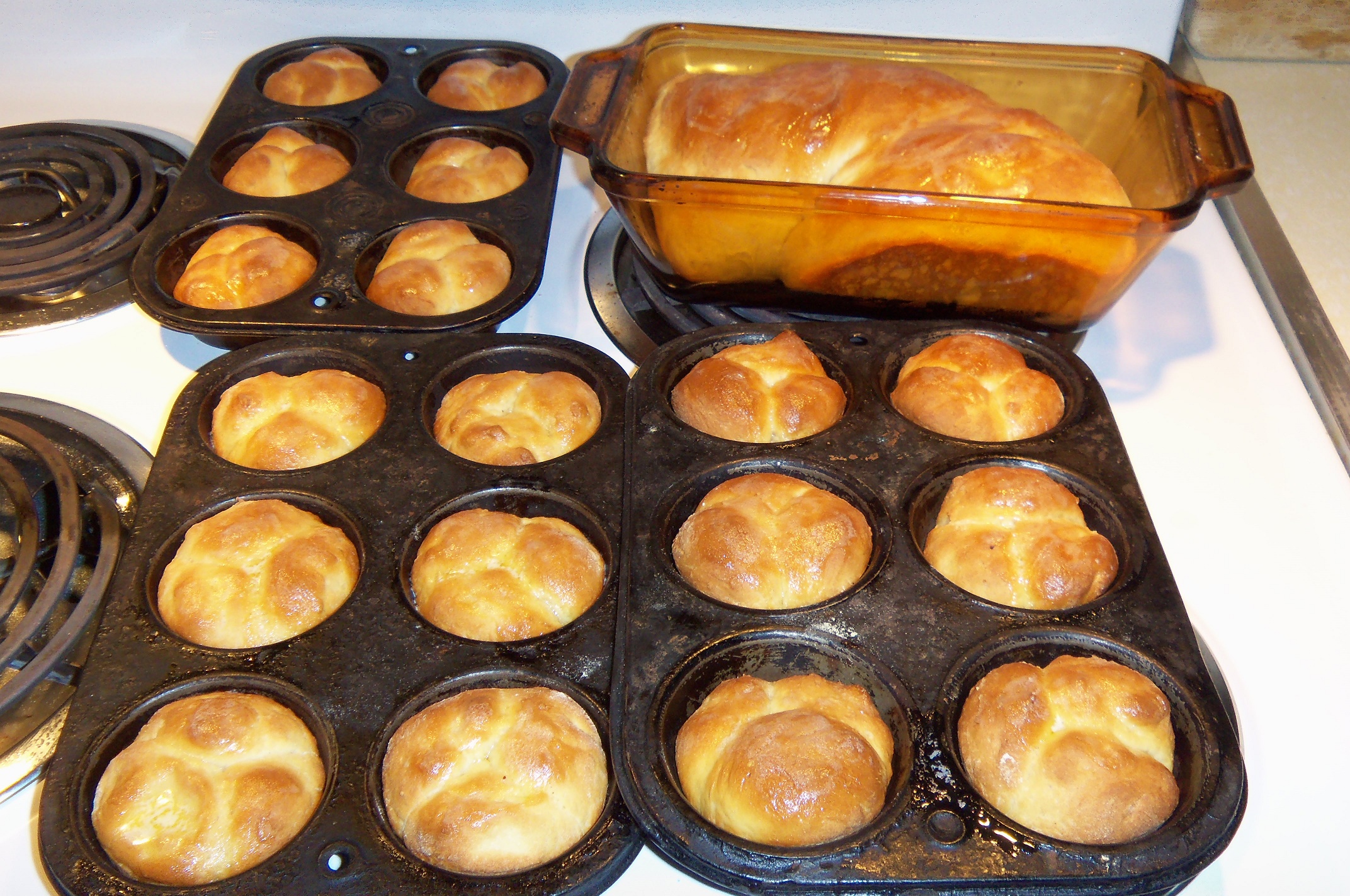 The milk, honey, everything else was ready to go and I couldn’t bear the thought of wasting it, so I trekked to the store for more yeast. By bedtime, the bread had risen once, as it was supposed to do. Making it into rolls and a nice loaf, I popped it into the refrig. Through no fault of my own, my eyes opened at 2:30 this morning. I thought of the bread. So, I slid it from the refrigerator, set it on the cabinet, covered it with a clean dish towel and let it rise. At 6:30, into the oven it went.