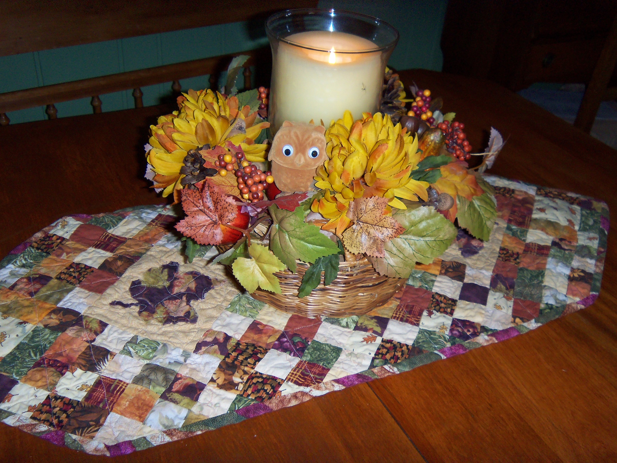 I love it when the past and the present come together in a harmonious grouping. This picture represents four generations. The table was my mother’s. My niece Missy made the pretty autumn table runner. Although I didn’t assemble it, the centerpiece is mine and sitting smugly among the chrysanthemums is a small owl Sara gave me three years ago. Four generations.